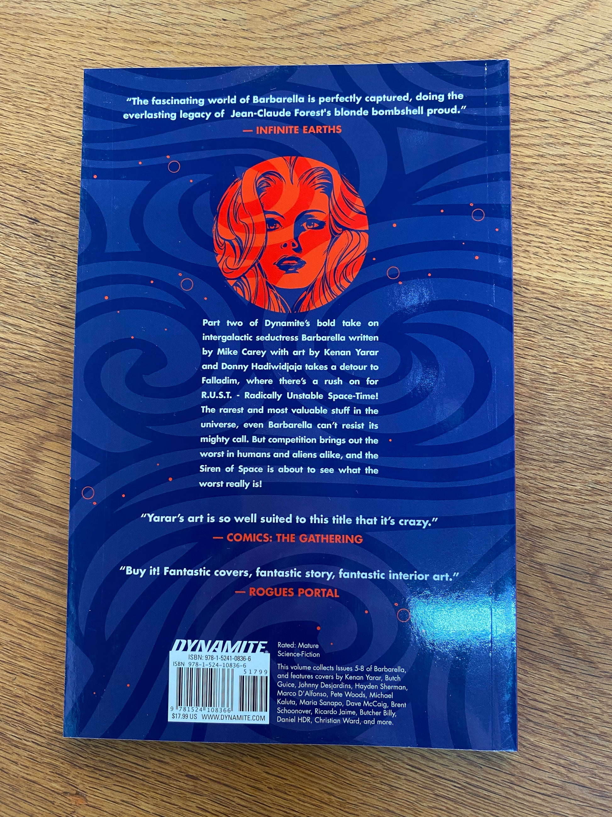 Barbarella's never ending quest to repair her ship's regulator and be on her way takes a detour to Falladim, where there's a rush on for R.U.S.T.-Radically Unstable Space-Time! The rarest and most valuable stuff in the universe, even Barbarella can't resist its mighty call. But competition brings out the worst in humans and aliens alike, and the Siren of Space is about to see what the worst really is!