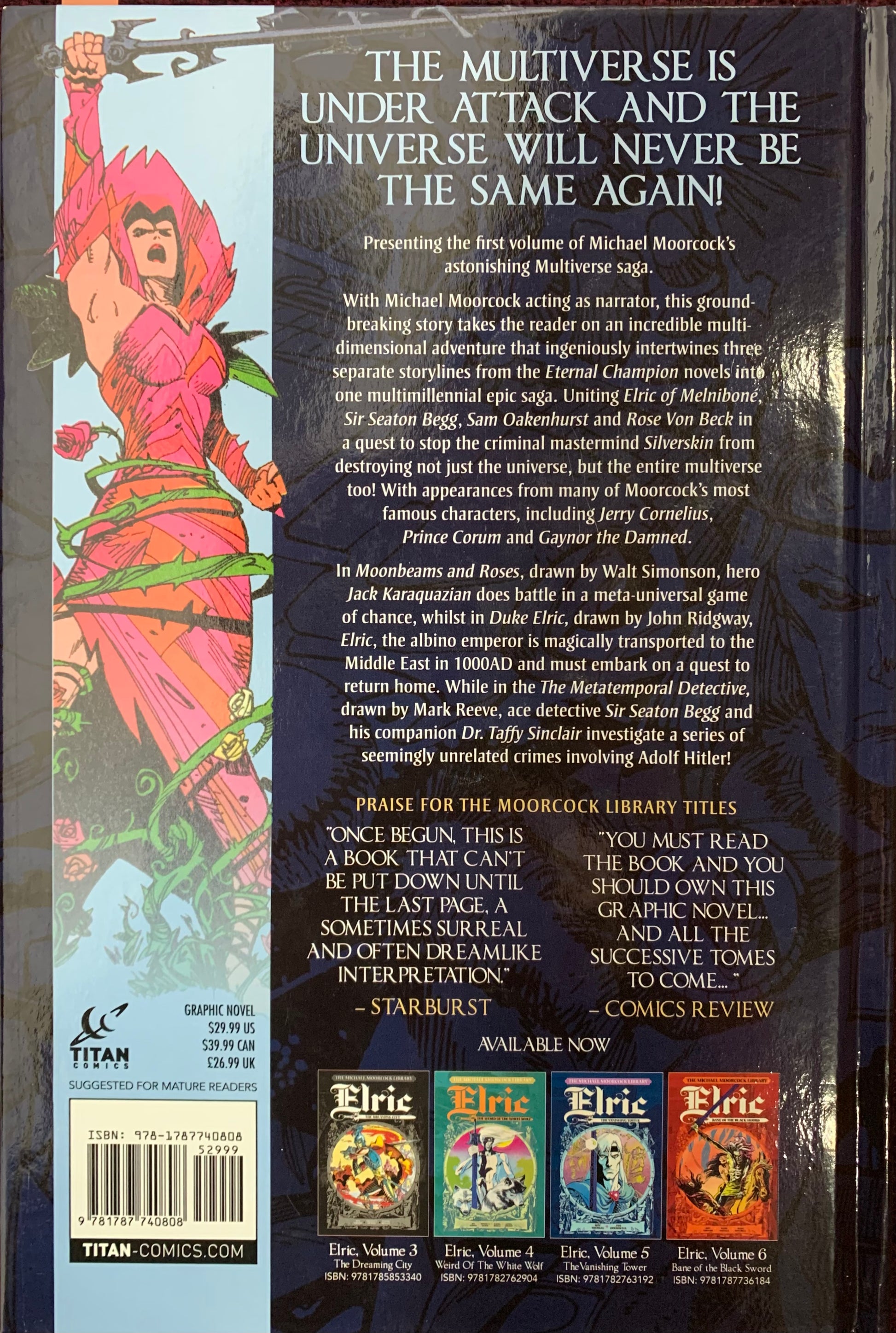 The first graphic novel in this ground-breaking series written by the legendary Michael Moorcock and illustrated by one of the true masters of the comic arts, Walt Simonson. Collecting the first six issues of the Multiverse series, the story sees diverse heroes from Moorcock’s sprawling Eternal Champion series united in a common quest to stop the criminal mastermind Silverskin from destroying the multiverse. Multiverse is Moorcock’s epic 12 issue series combining three unique and separate storylines from the Eternal Champion novels into one centuries-spanning epic story that unites Elric of Melnibone, Sir Seaton Begg, Silverskin, Sam Oakenhurst and Rose Von Beck in an adventure told across thousands of years of time. With one of three artists illustrating each story, Walt Simonson on Moonbeams and Roses, John Ridgeway on Duke Elric and Mark Reeve on The Metatemporal Detective. Set across three unique locations and time-lines, the three story arcs follow the mutual search for the enigmatic underworld crime lord, Silverskin concluding with the convergence of the three plots. In Moonbeams and Roses, hero Jack Karaquazian does battle in a meta-universal game of chance with leading characters from the Moorcock universe including Moorcock and Simonson themselves. While in The Metatemporal Detective ace detective Sir Seaton Begg and his companion Dr. Taffy Sinclair investigate a series of seemingly unrelated crimes in the period between world wars, crimes involving Adolf Hitler. Finally in Duke Elric, the albino emperor himself is magically transported to the Middle East in 1000AD and forced to embark on a quest to return him home.